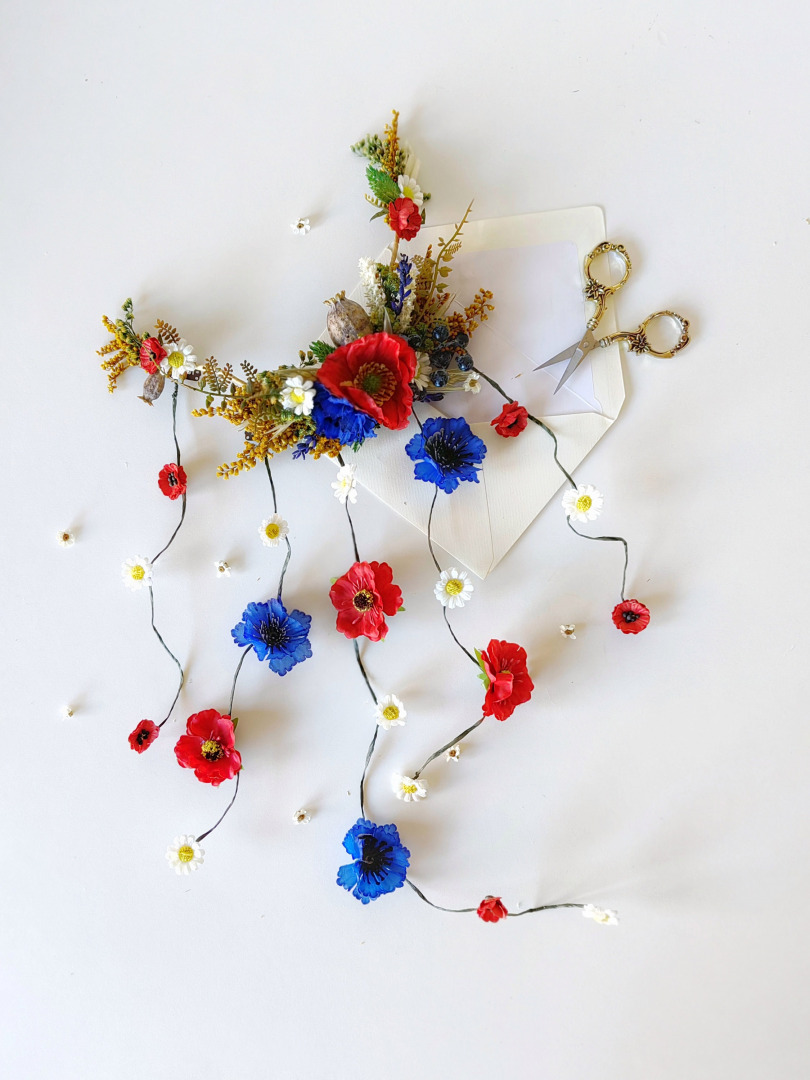 Folk wedding hair arrangement/vine with veil. Folk meadow design with poppy flowers, corn flowers or daisy flowers...