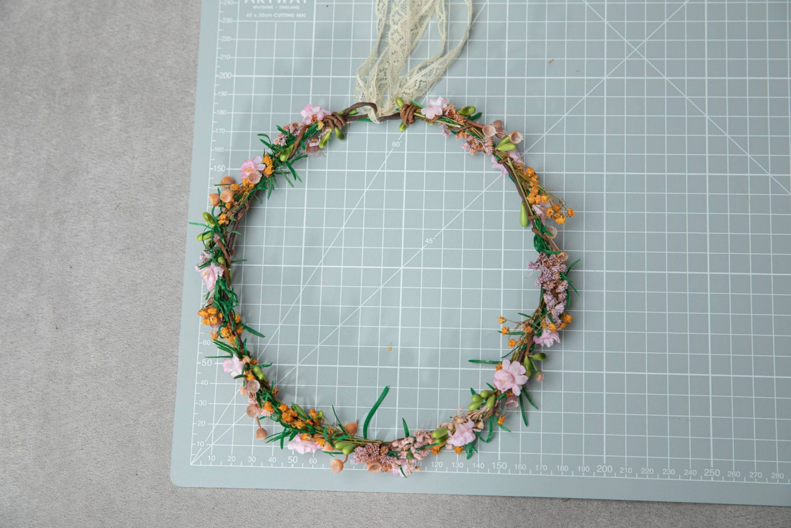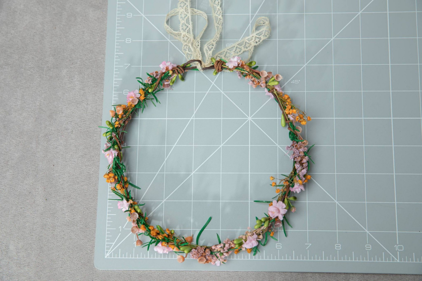Kvetinový venček v boho rustikálnom dizajne. Obvod venčeku je 48-53 cm. Veľkosť je univerzálna, venček sa viaže a prispôsobuje viazaním stuhou v zadnej časti.