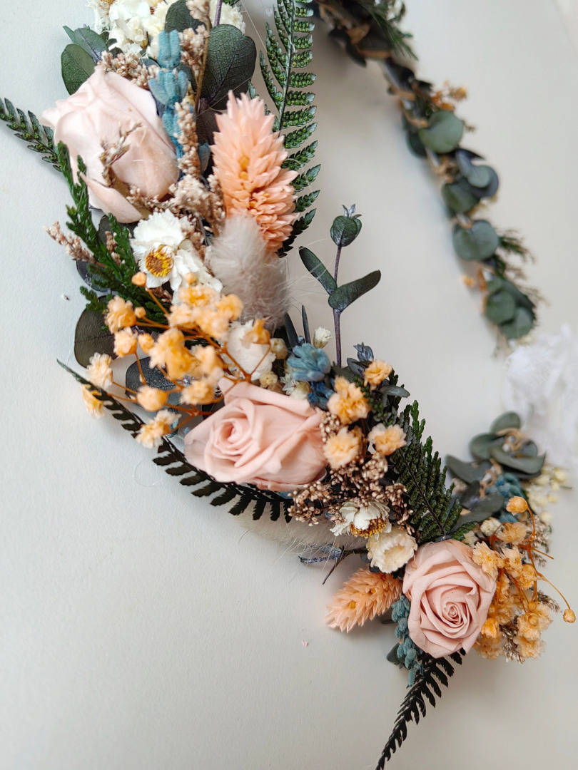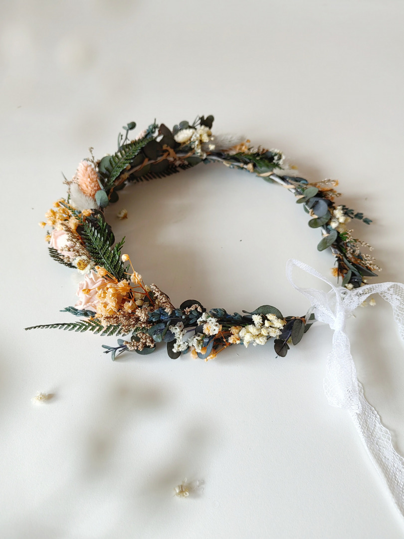Hair wreath is made from preserved flowers. Fragile natural material. Some dried flowers may fall off. It is normal and it shouldn't affect the overall design.