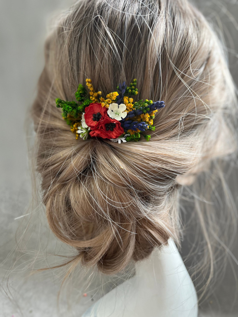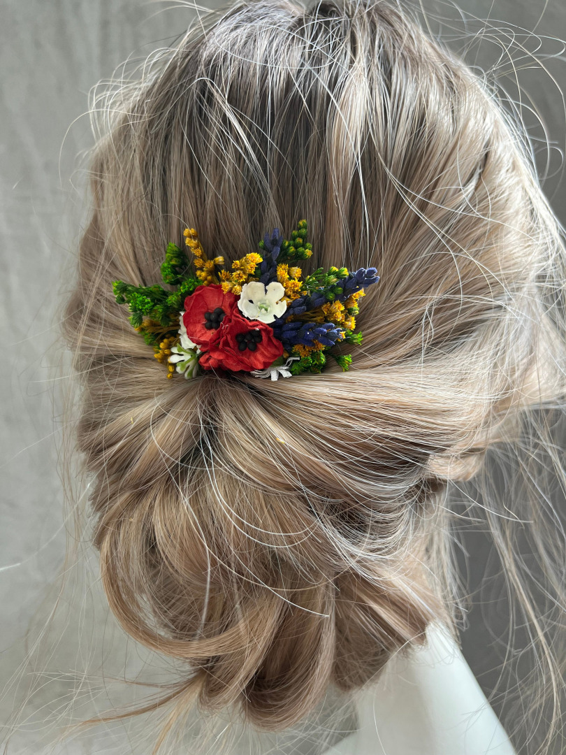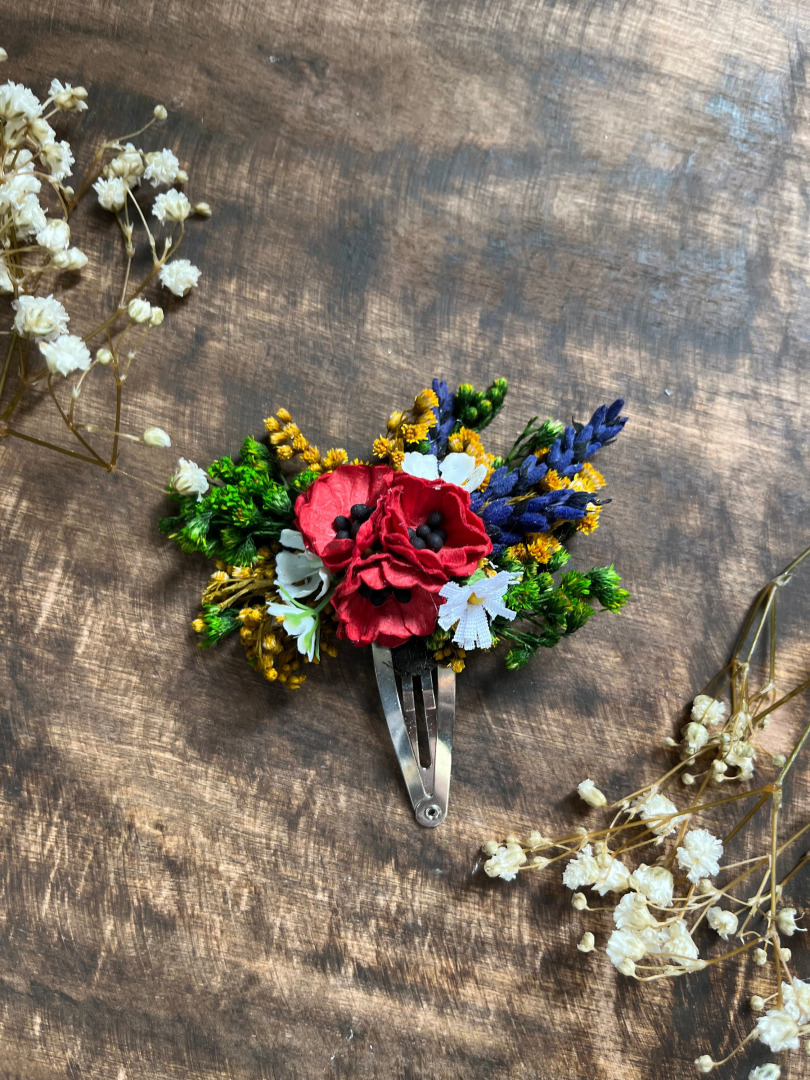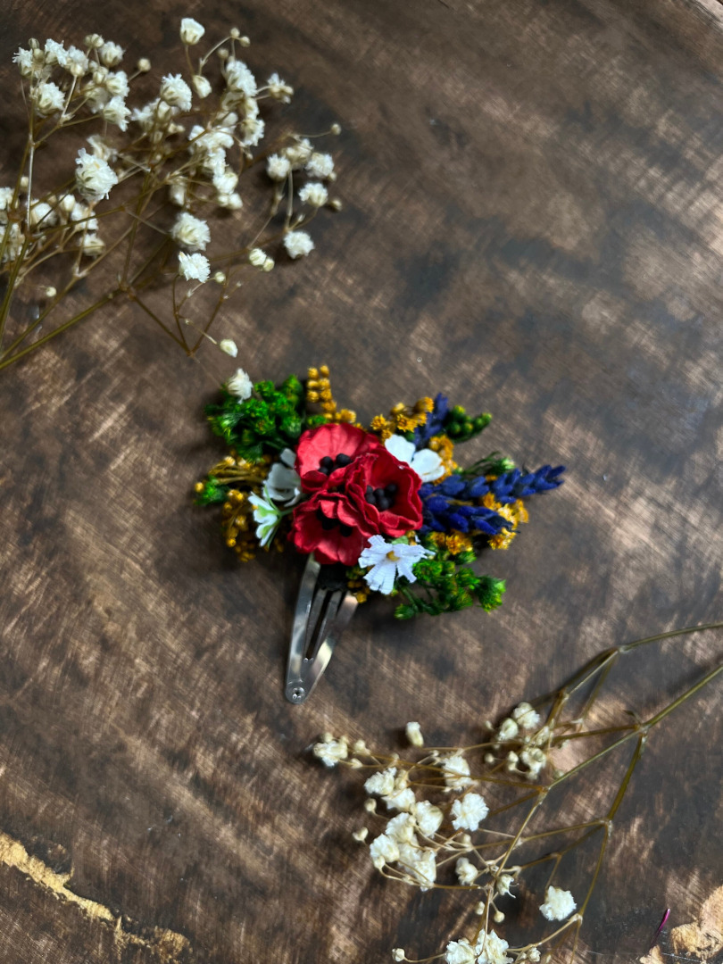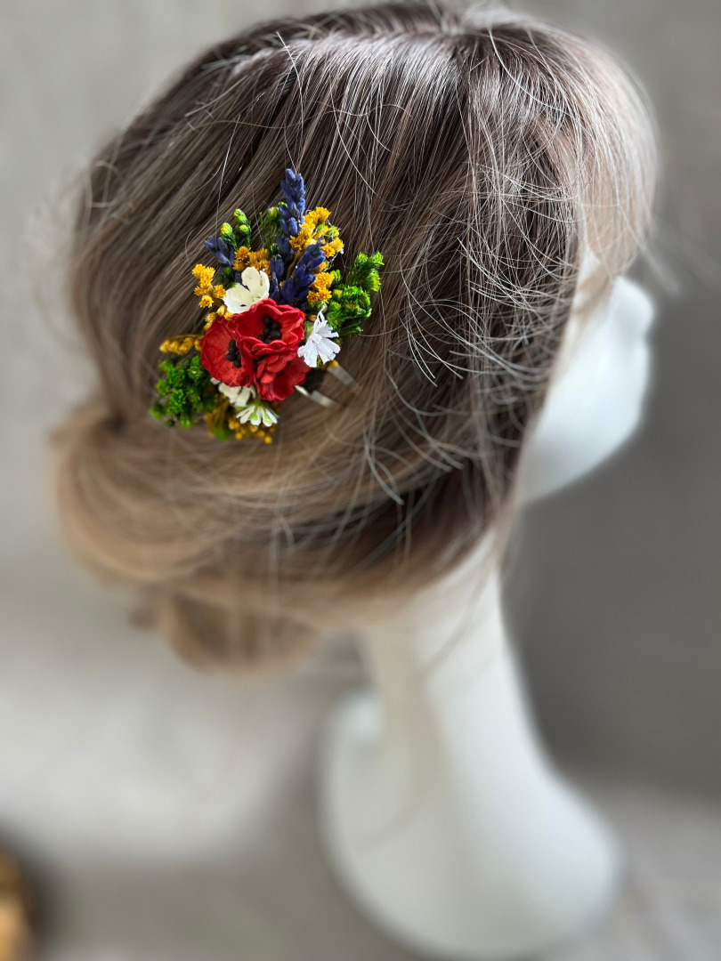 The flower hair clips are made of preserved and artificial flowers, grass, leaves and floristic tape,...