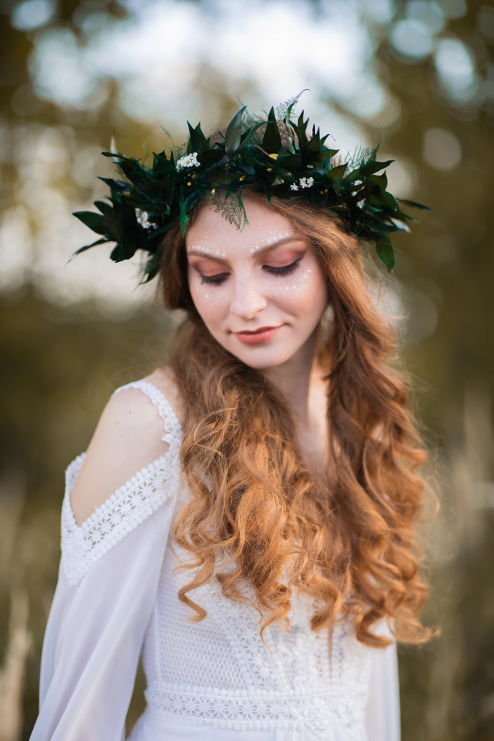 The flower crown is made of preserved leaves, ferns, flowers, wire, floristic tape and other trinkets used for arranging.