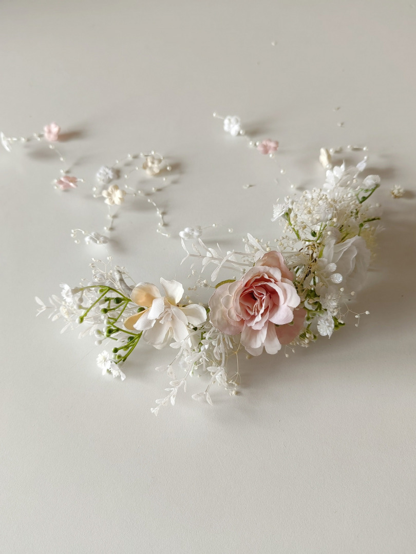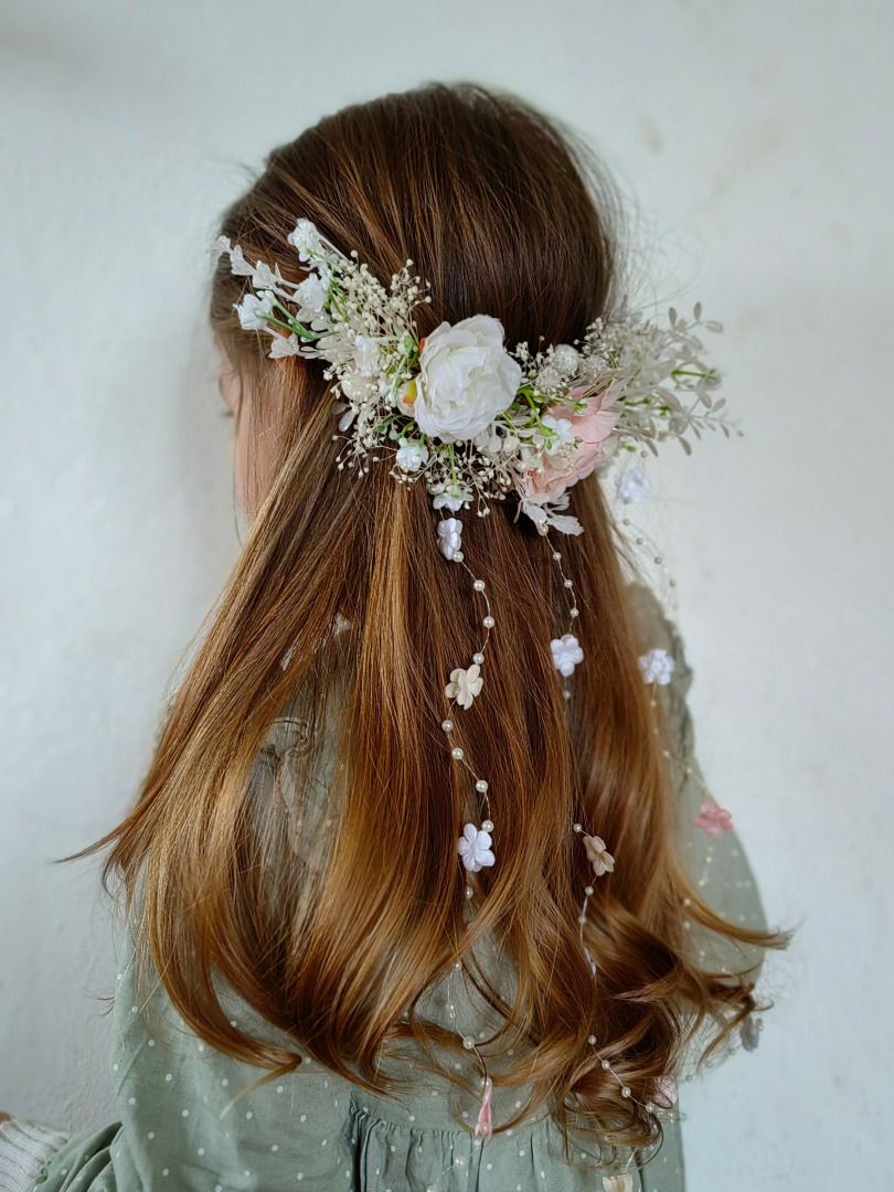 Romantic hair vine with a floral veil for a beautiful boho wedding hairstyle. Suitable for wedding or for holy communion. The hair vine and the veil are mostly made of artificial flowers in pink, white, cream and green tones...