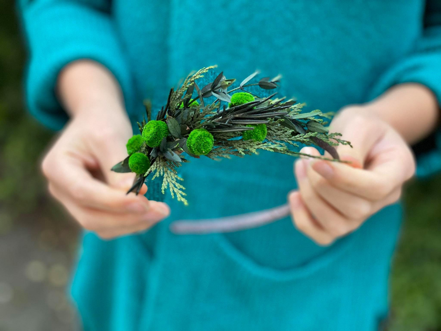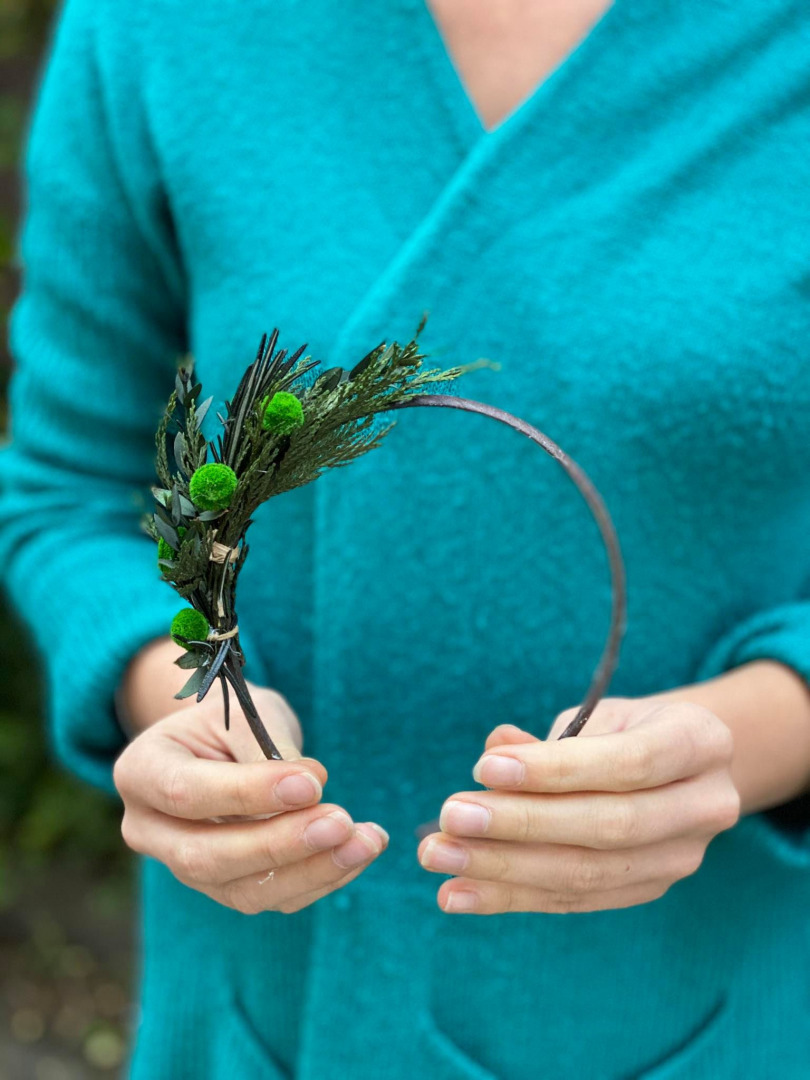 This natural headband is made of preserved flowers, leaves and other arranging material.