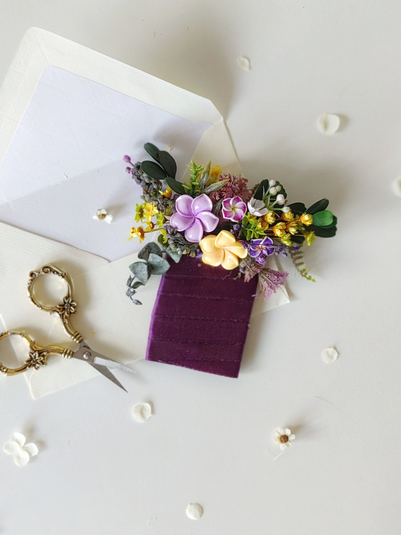 Pierka sú vyrobené z aranžérskych kvietkov, lístkov, trávy, stuhy a iných drobností určených k aranžovaniu