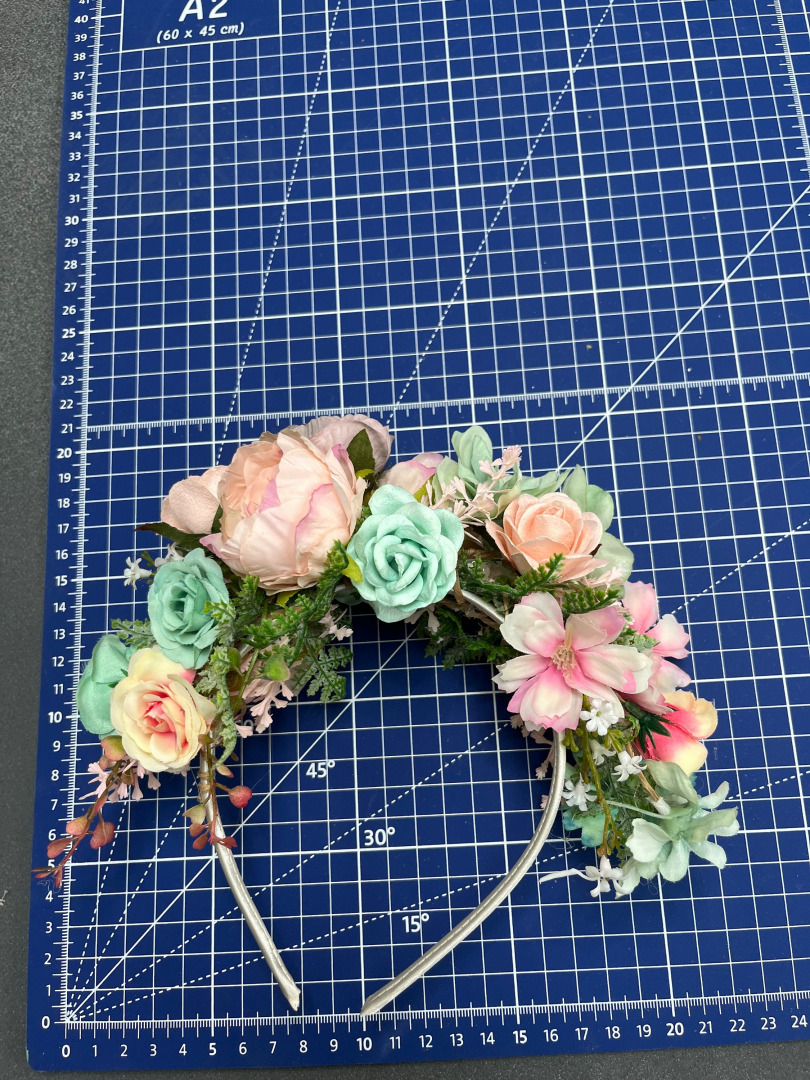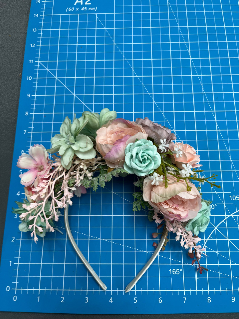 Čelenka je vyrobená z textilných kvetov, lístkov, trávy a iných drobností určených k aranžovaniu.