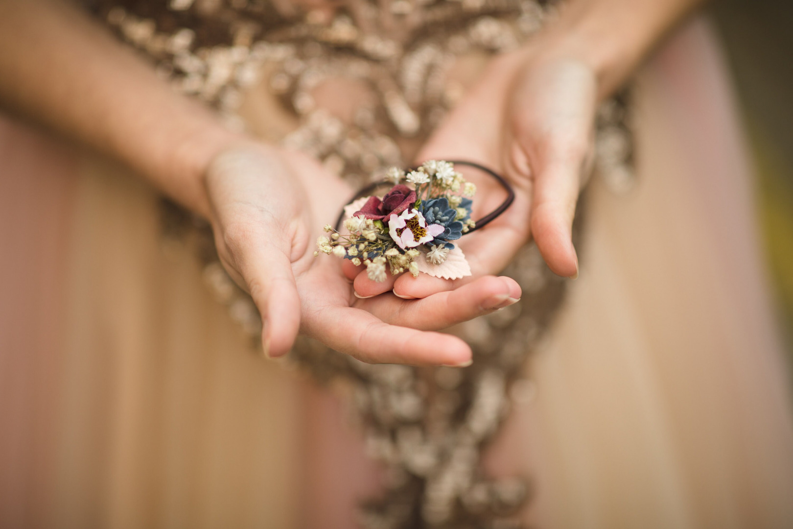 The flower hair tie is made of artificial flowers, leaves, grass and other trinkets used for arranging.
