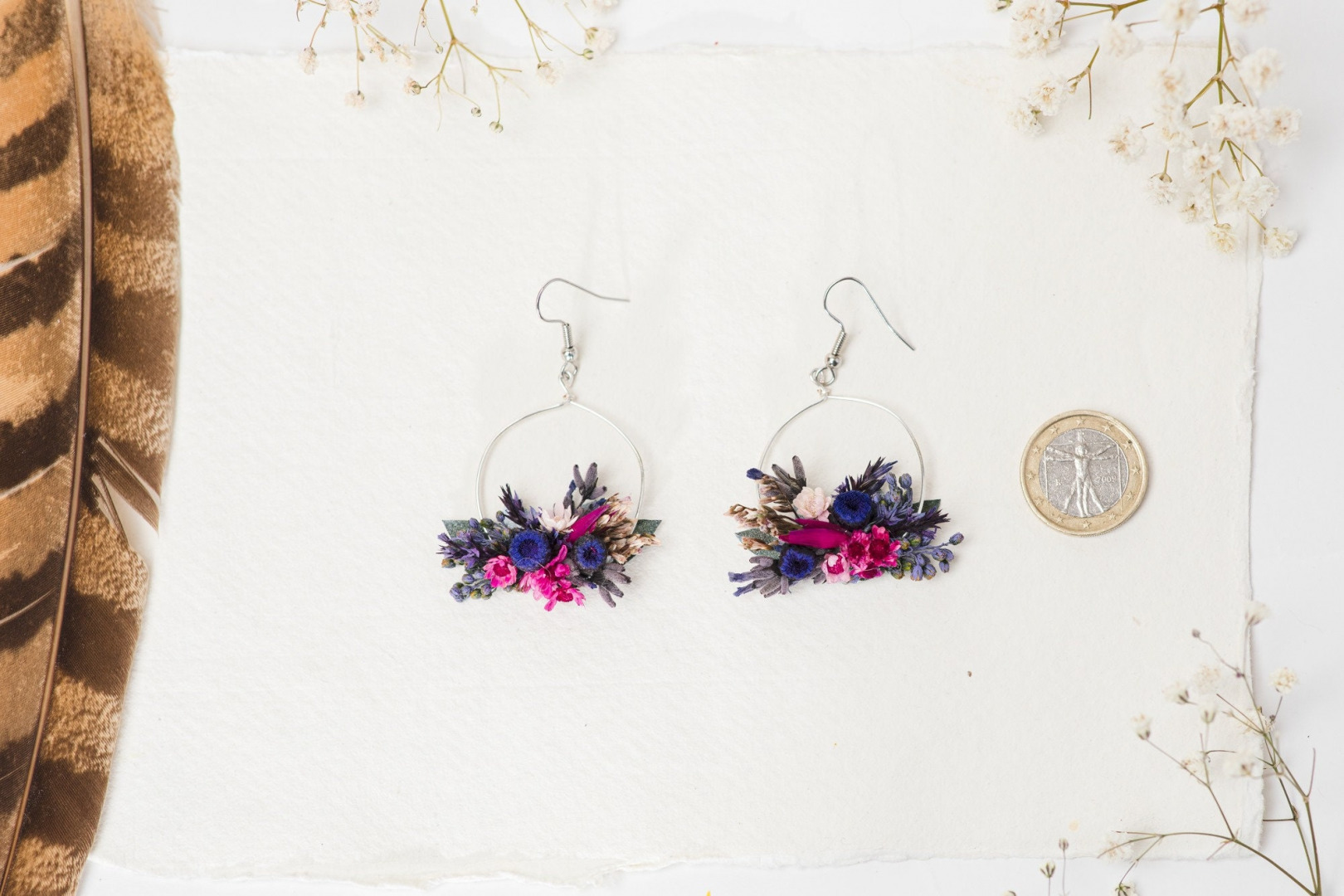 The earrings are made of preserved flowers, leaves and grass, wire, and other trinkets used for arranging :)