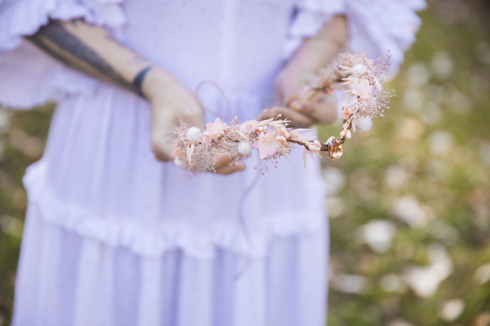 The flower headpiece is made of artificial and preserved flowers, leaves, grass, wire, crystals and other trinkets used for arranging.