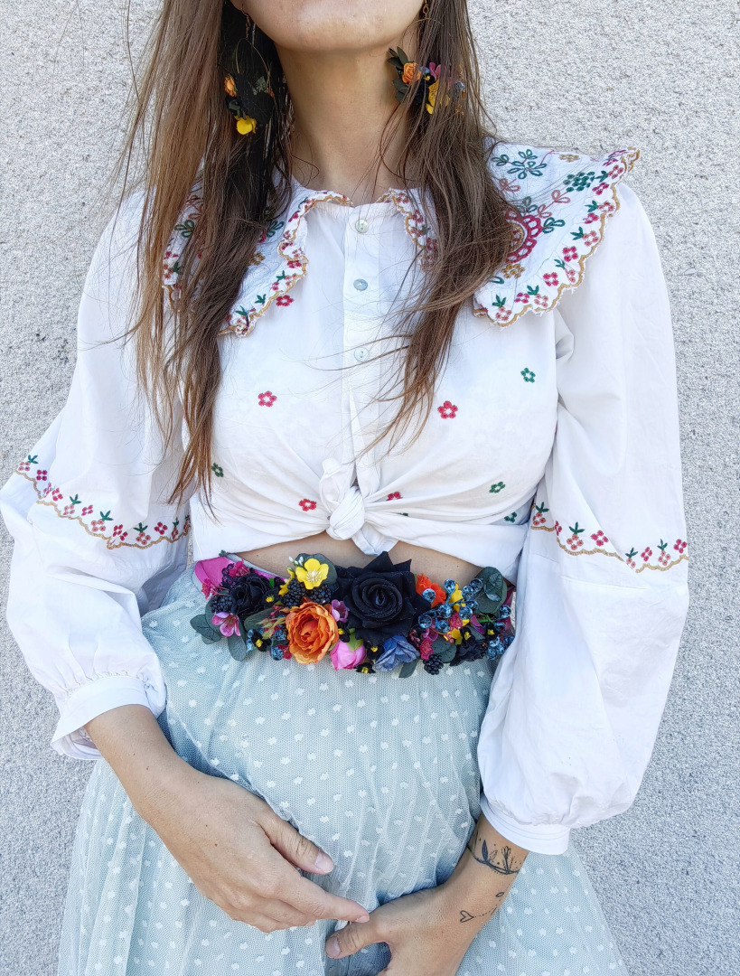 Bridal flower belt for (not only) wedding dress. Boho design, colorful design with black roses and blackberries...