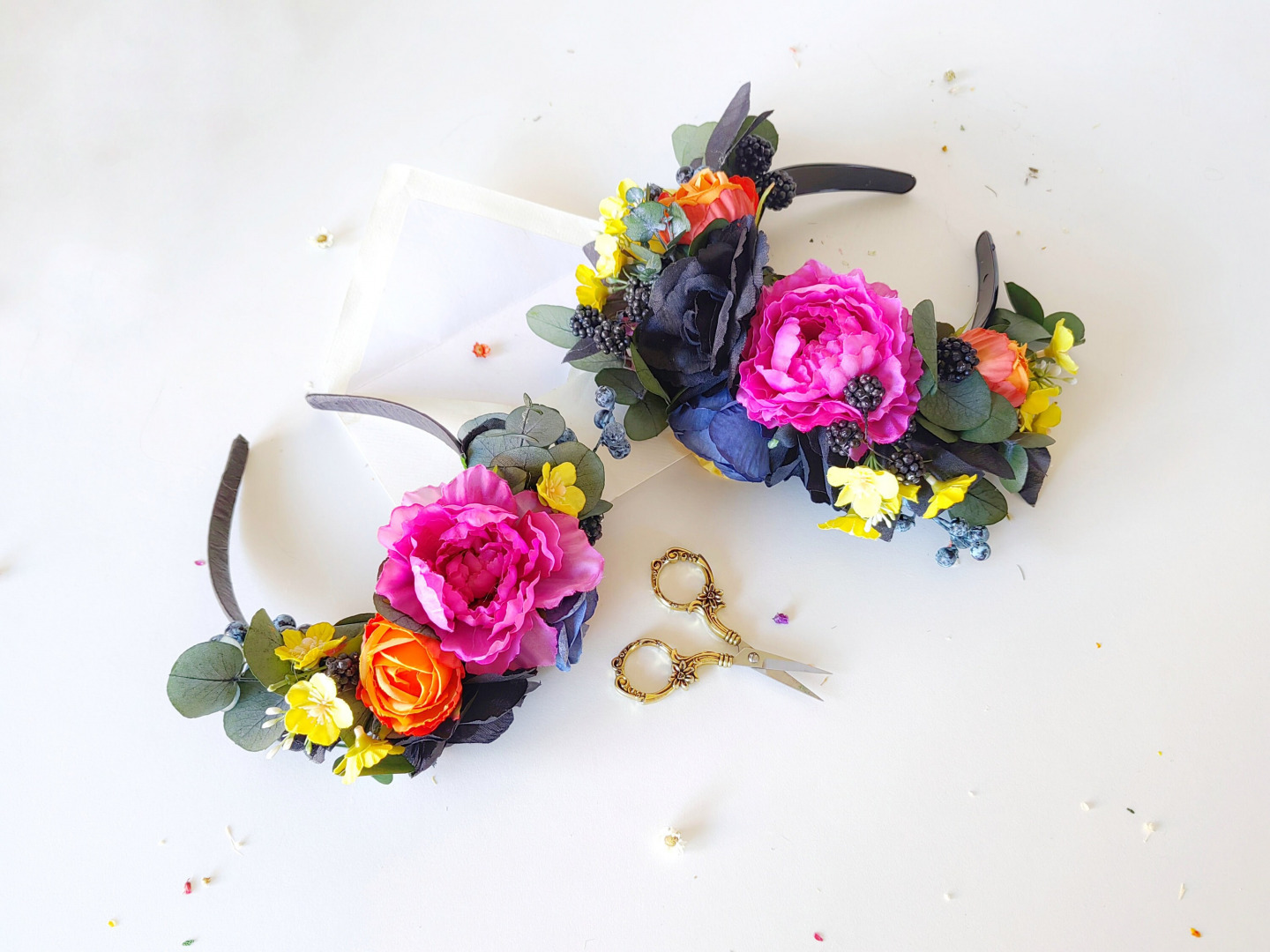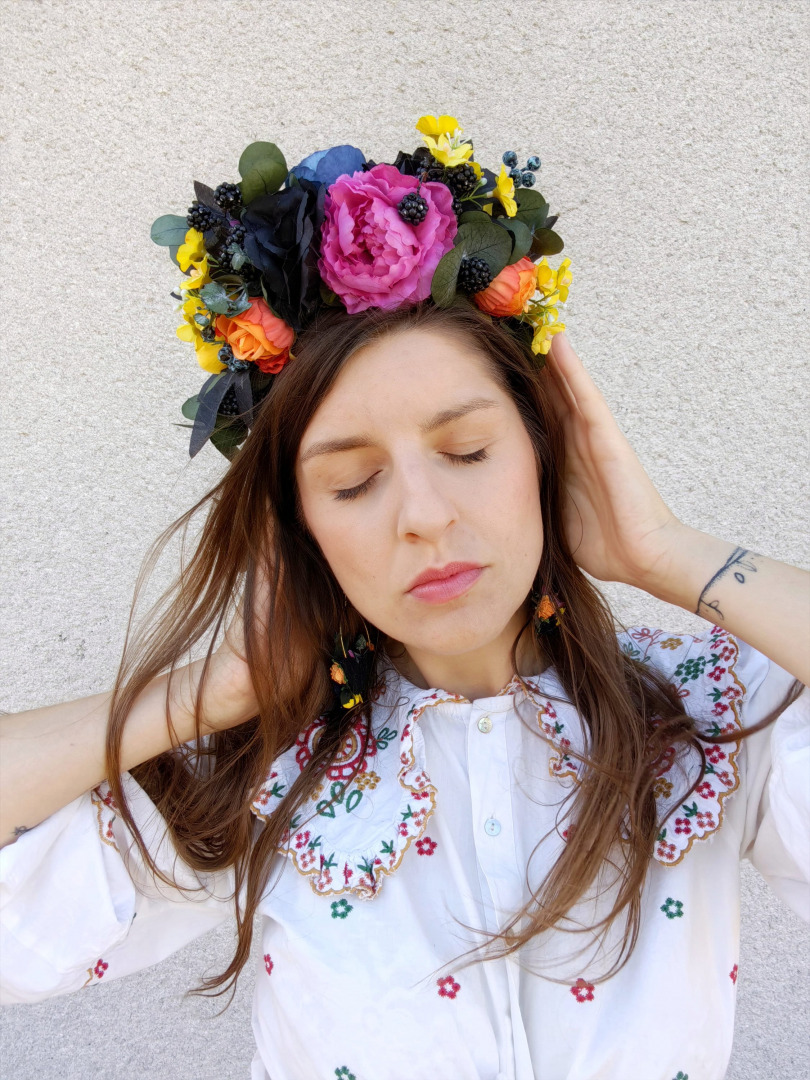Veľká boho kvetinová čelenka inšpirovaná umelkyňou Fridou. Čelenky sú obojstranné,takže máte dva dizajny v jednom a možnosť nosiť z oboch strán.