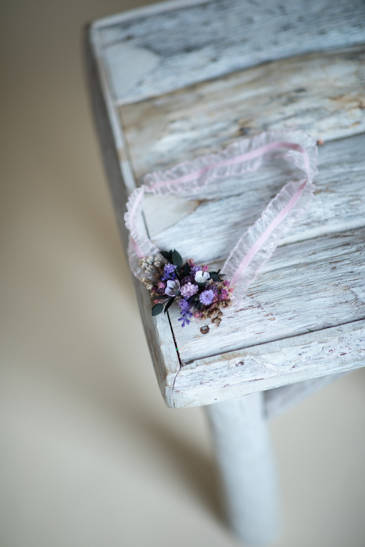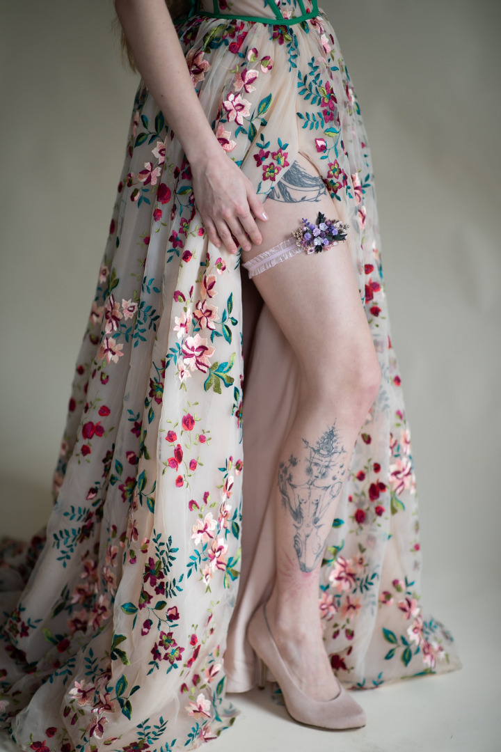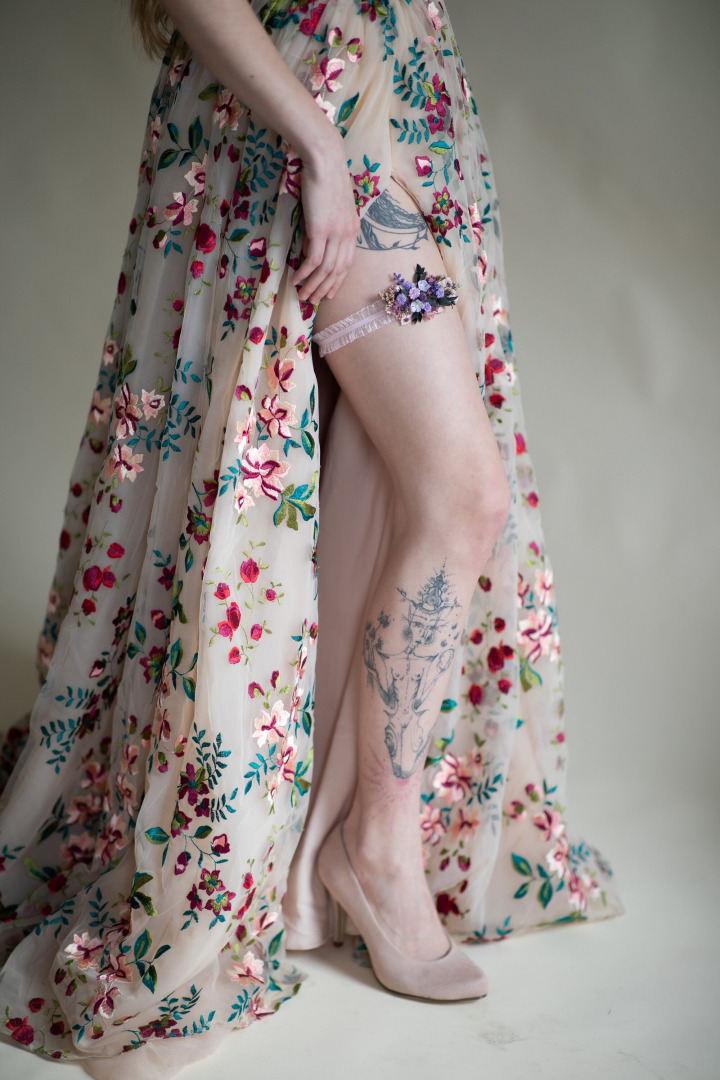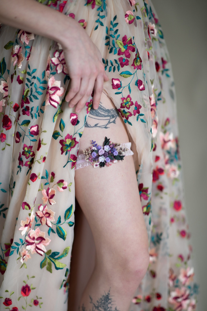 Kvetinový svadobný podväzok vo fialových tónoch na elastickej podväzkovej gumičke.