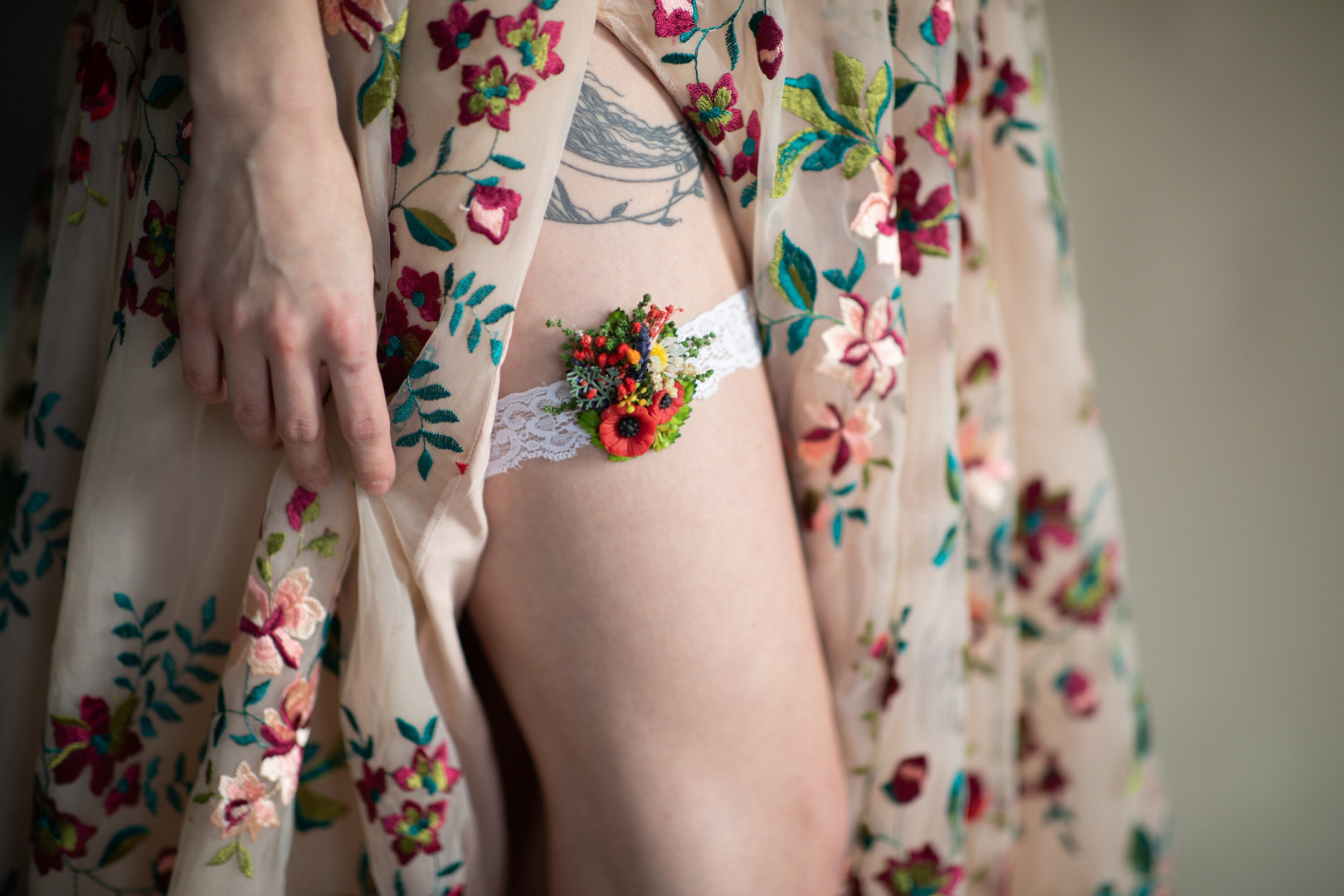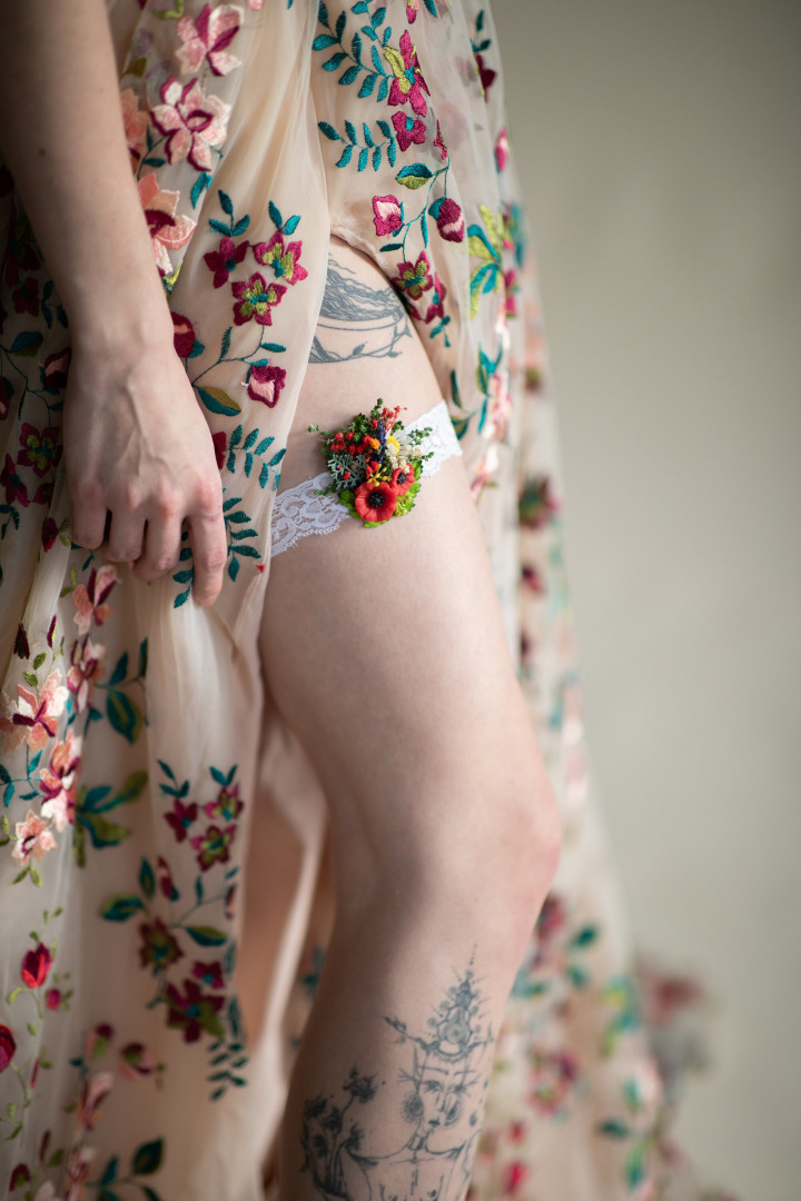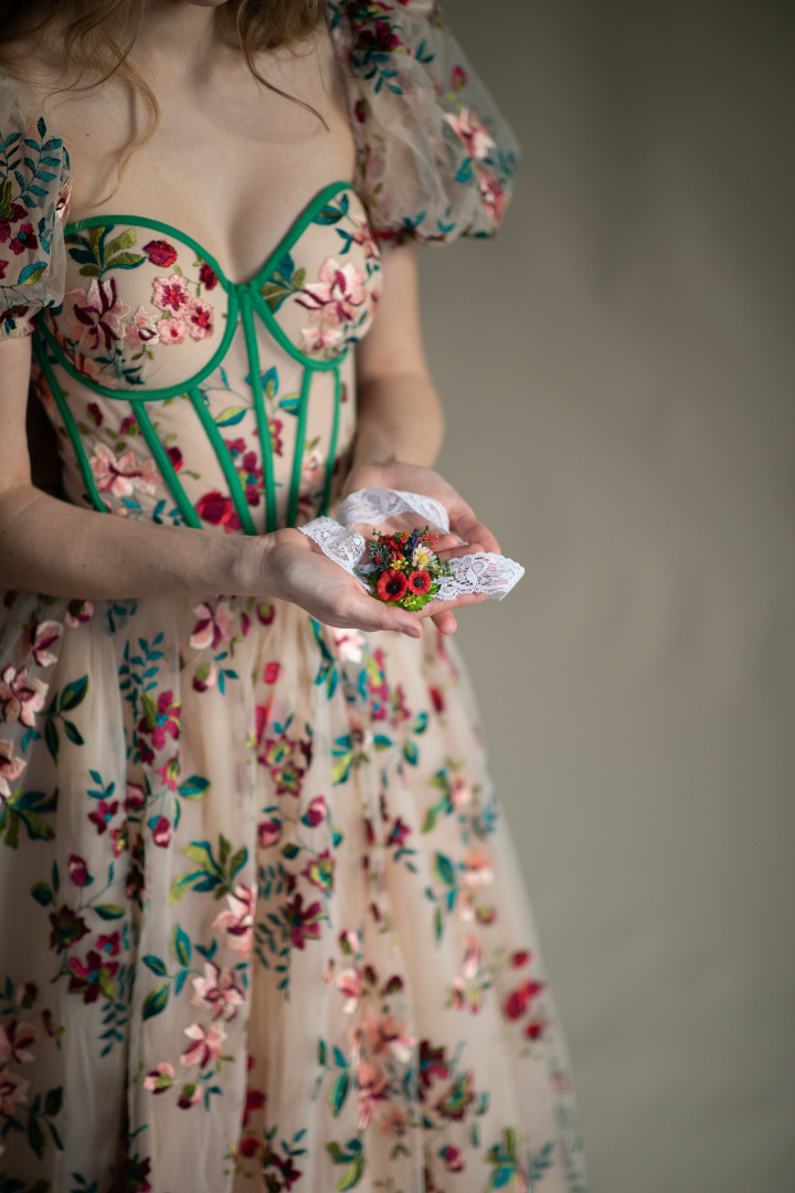 Kvetinový svadobný podväzok pre nevestu s lúčnymi kvetmi vo folk ľudovom dizajne na elastickej čipke.