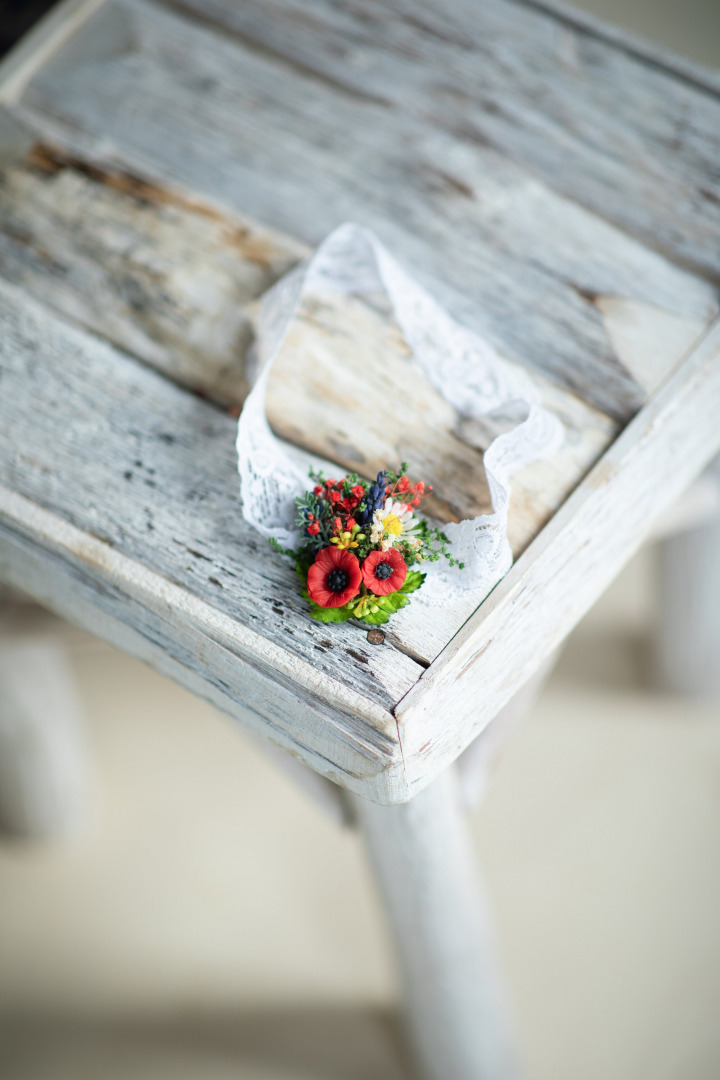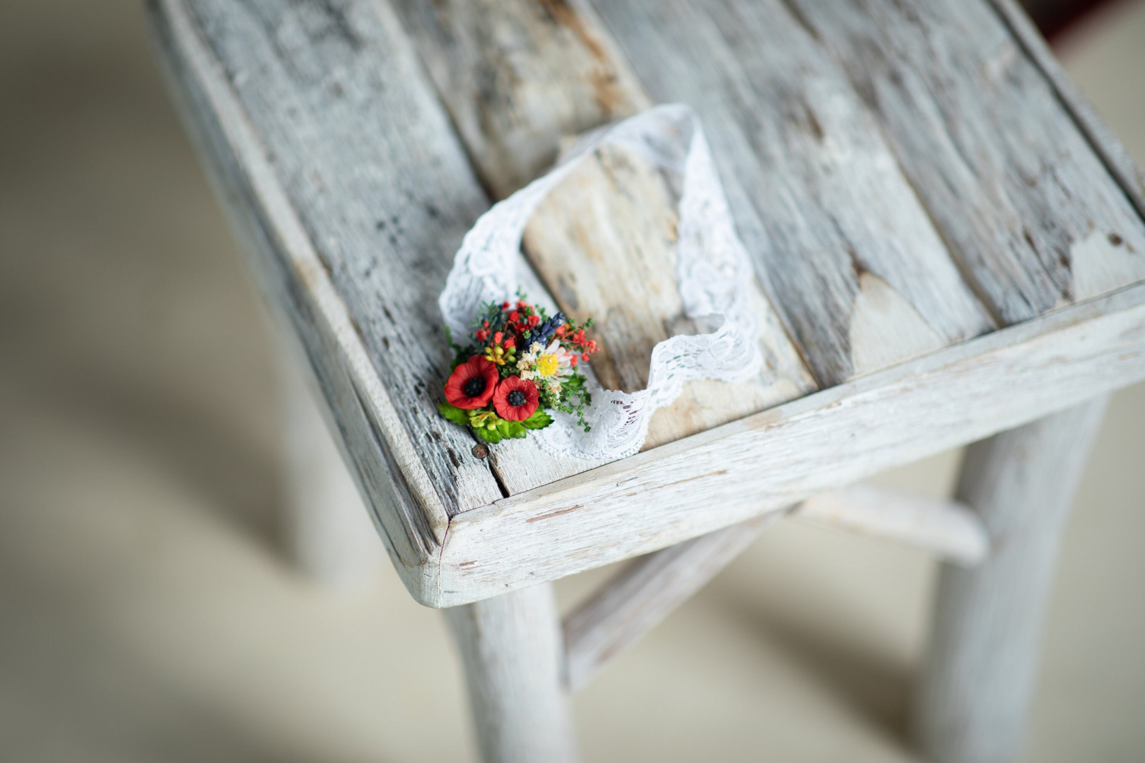 Podväzok je vyrobený z textilných kvetov, lístkov, trávy, gumičky krajky a iných drobností určených k aranžovaniu.