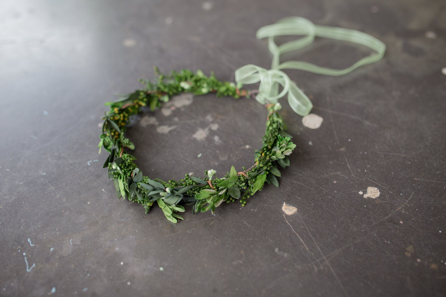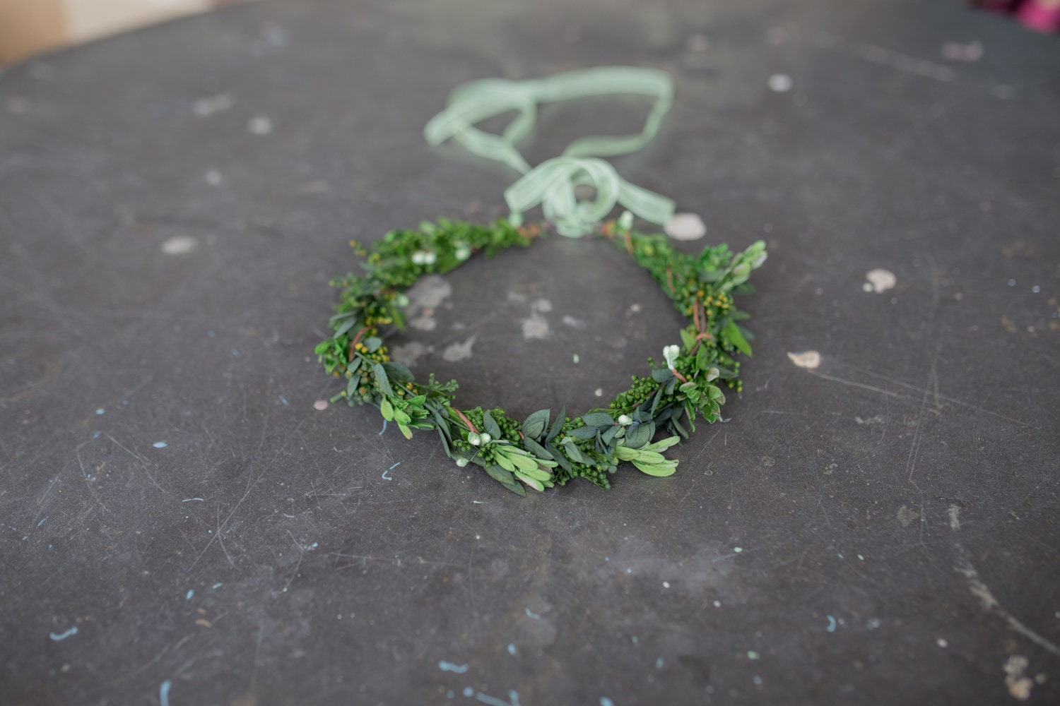 Venček je vyrobený z konzervovaných lístkov a trávy.