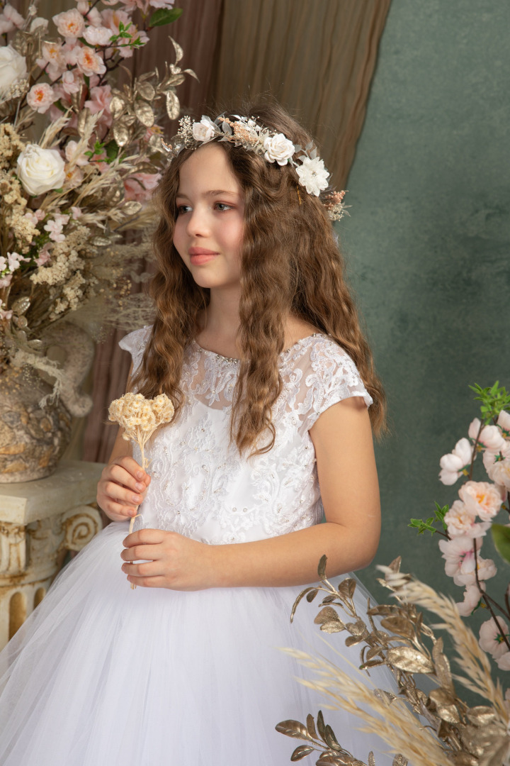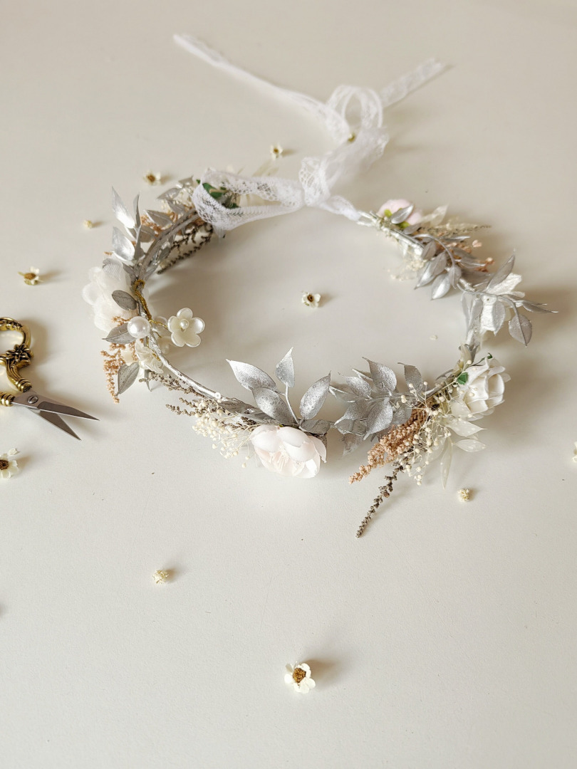 This hair wreath is made of artificial flowers and preserved material. Elegant headpiece handcrafted with love. We also offer other headbands, floral belts, bracelets, head wreaths or candle decoration for first holy communion.