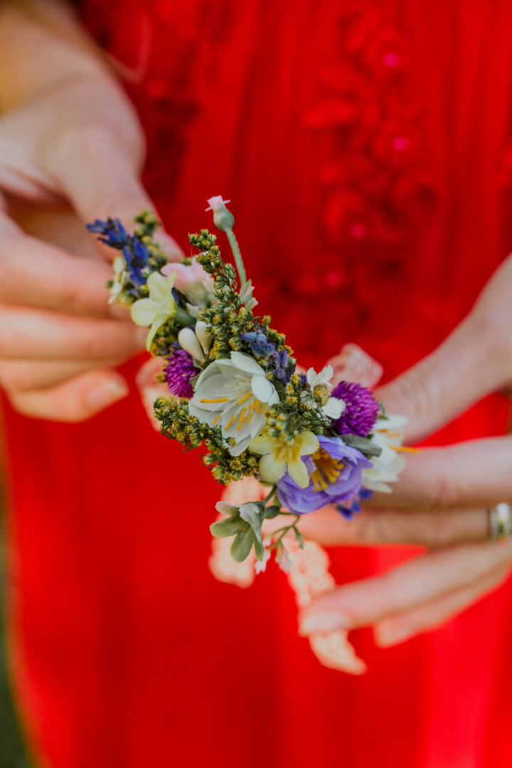 The flower bracelet is made of artificial flowers, preserved flowers, lavender, grass, ribbon and other trinkets used for arranging.
