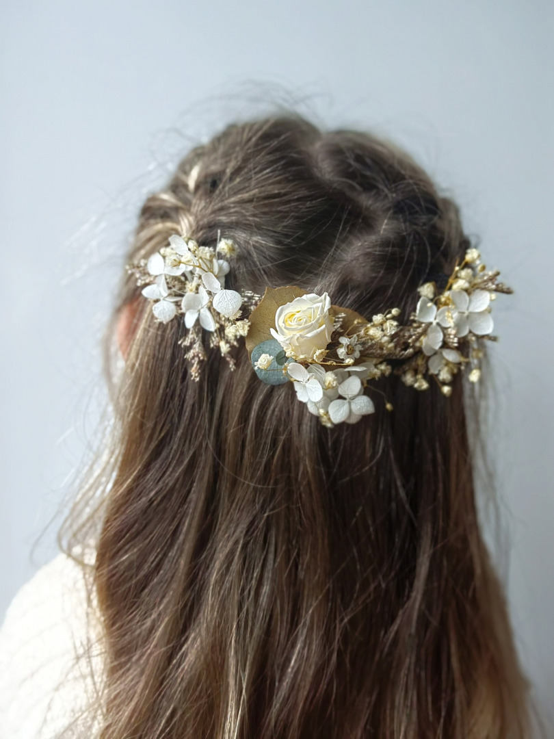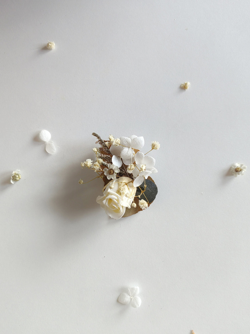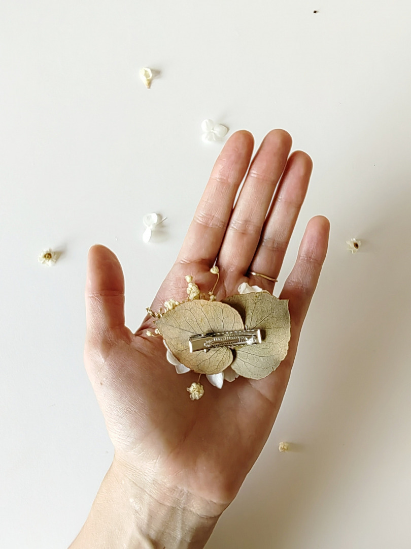 The hair clips are made of preserved and dried material and other trinkets used for arranging :) It's a fragile natural material, it can fall slightly, especially during transport. But it is not a fault of the product