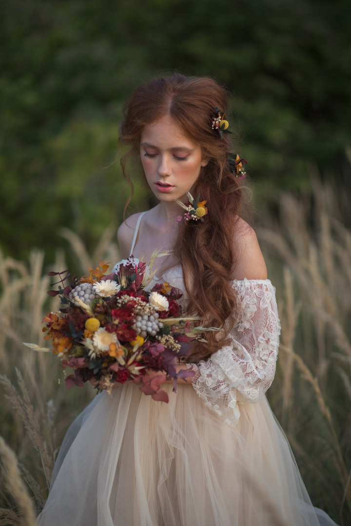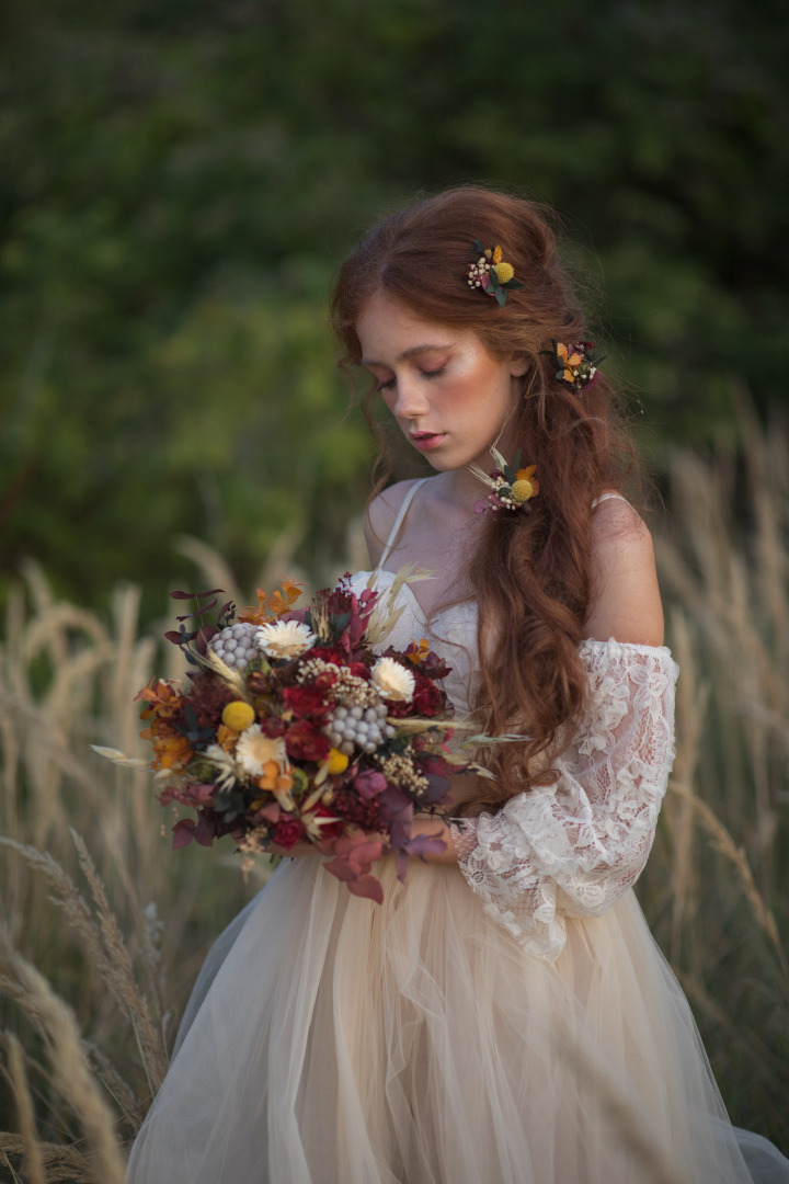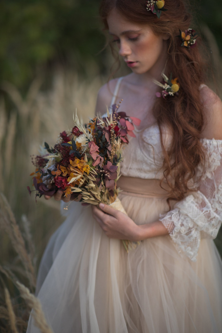 Svadobná boho kytica z umelých a konzervovaných materiálov. Životnosť kytice je pri správnom skladovaní a starostlivosti 10-15 rokov (viac sa dozviete v sekcii STAROSTLIVOSŤ). Kyticu nikdy nedávajte do vody