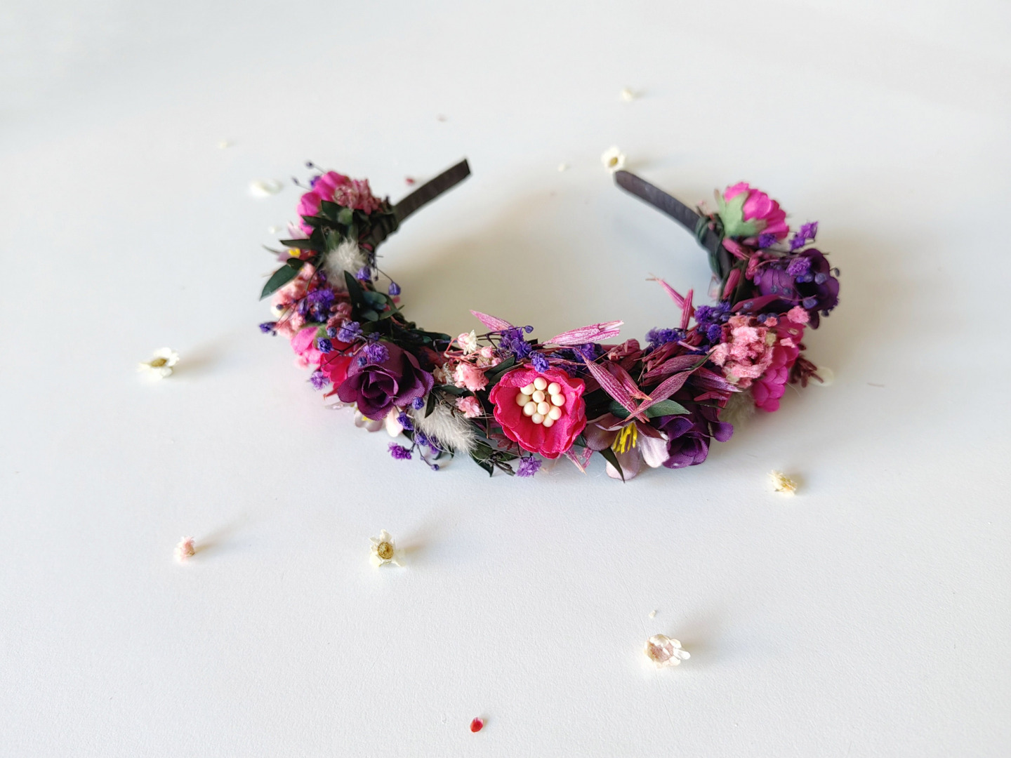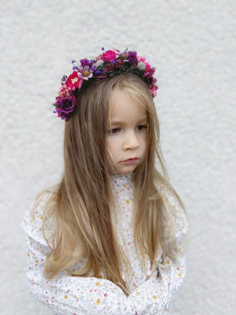 Klasická kvetinová čelenka na špeciálne príležitosti aj bežný deň,zdobená po celom obvode. Mäkký ohybný základ,netlačí ani pri okuliaroch. Univerzálna,vhodná už pre deti od dvoch rokov.