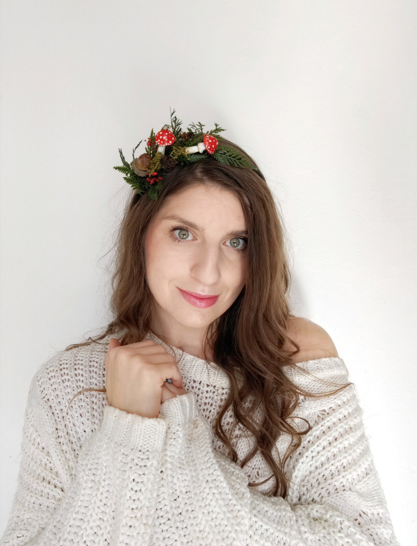 Čelenka je vyrobená z konzervovaných a umelých materiálov. Muchotrávky sú ručne modelované a maľované.