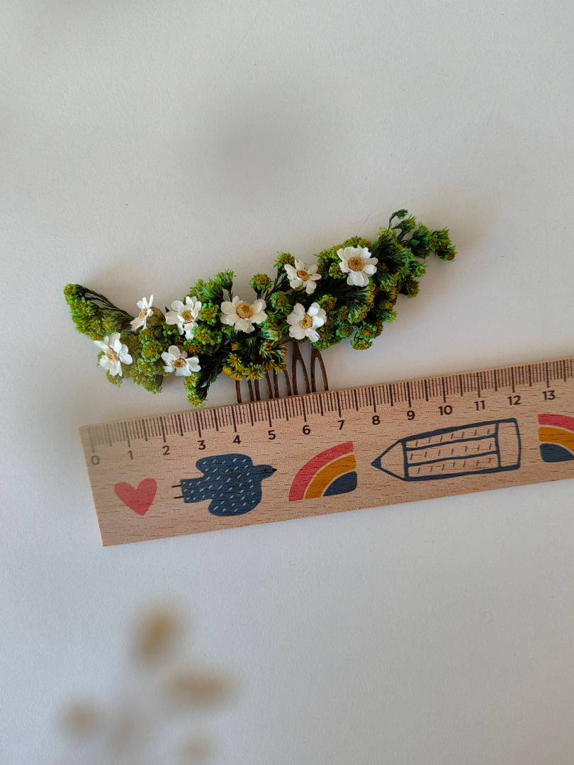 Smaller bridal hair comb made from preserved flowers and grass. Green and cream tones...