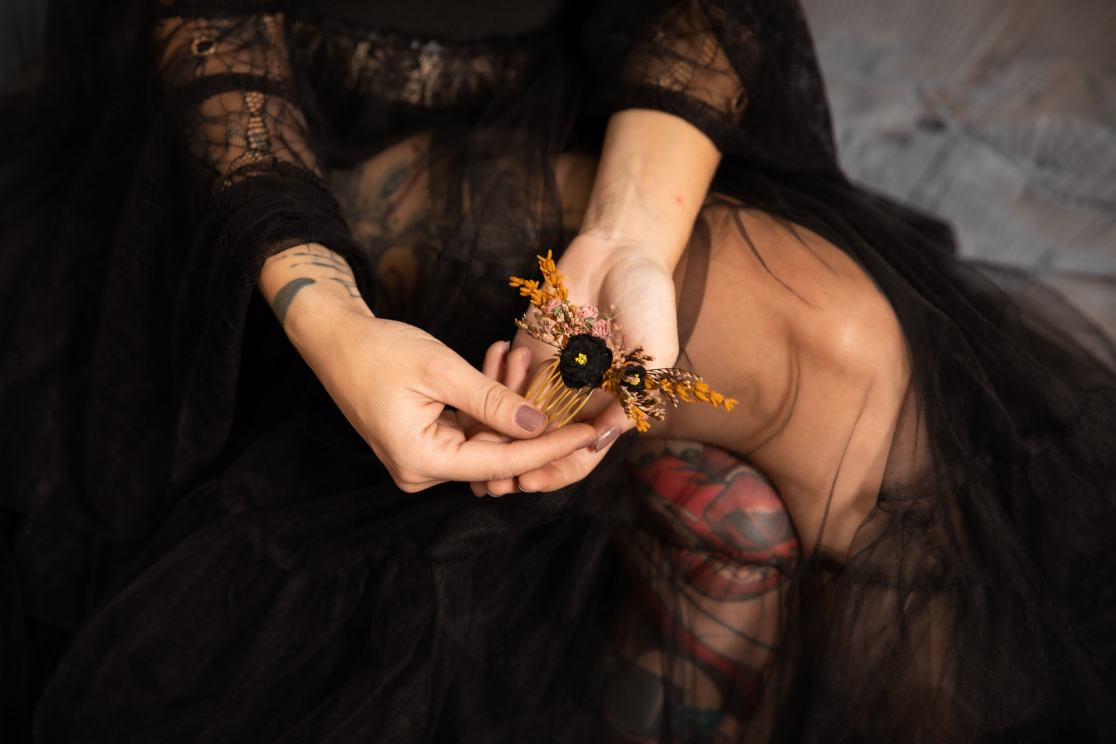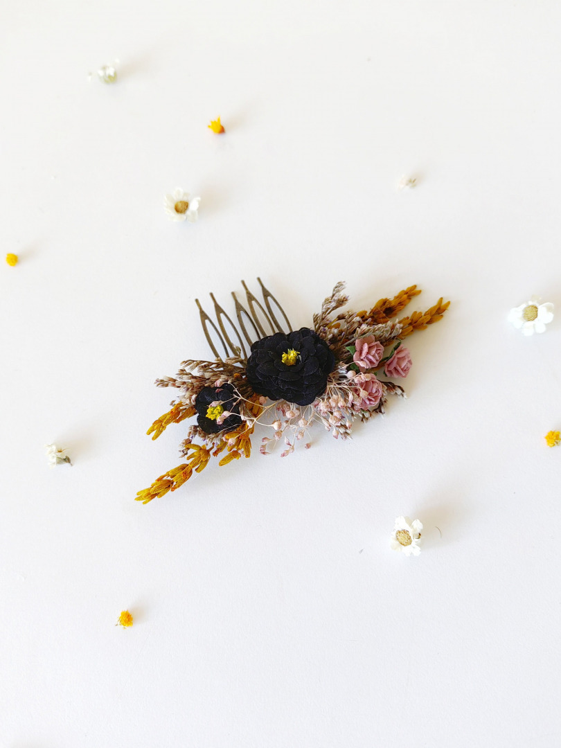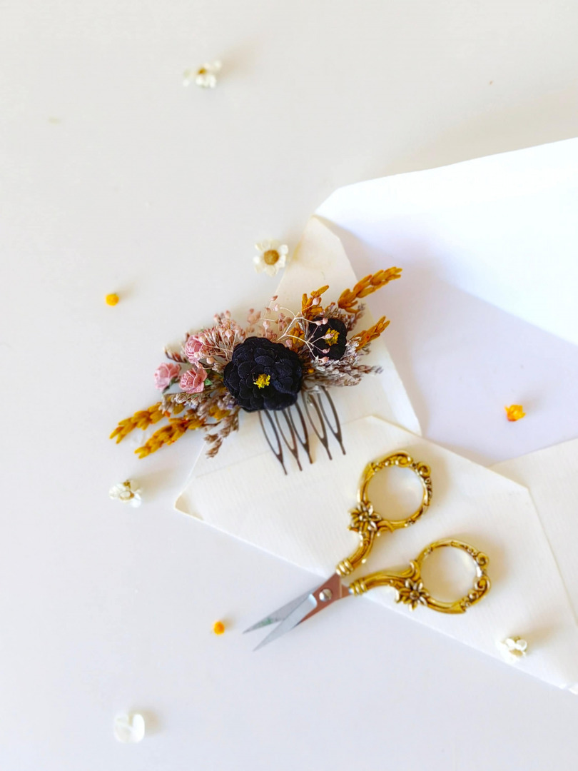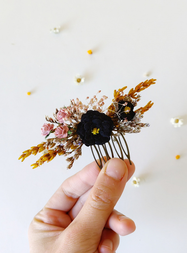 The flower hair comb is made of preserved and artificial flowers, grass, and other arranging material.
