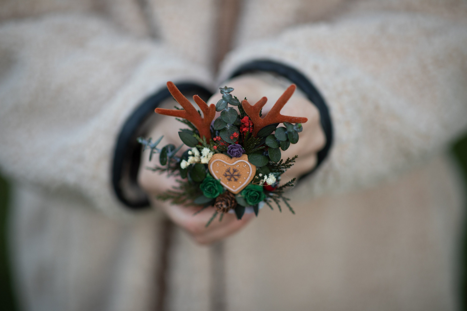 The brooch is made of artificial flowers, berries, preserved flowers leaves, antlers, safety pin, floristic tape and other arranging material.